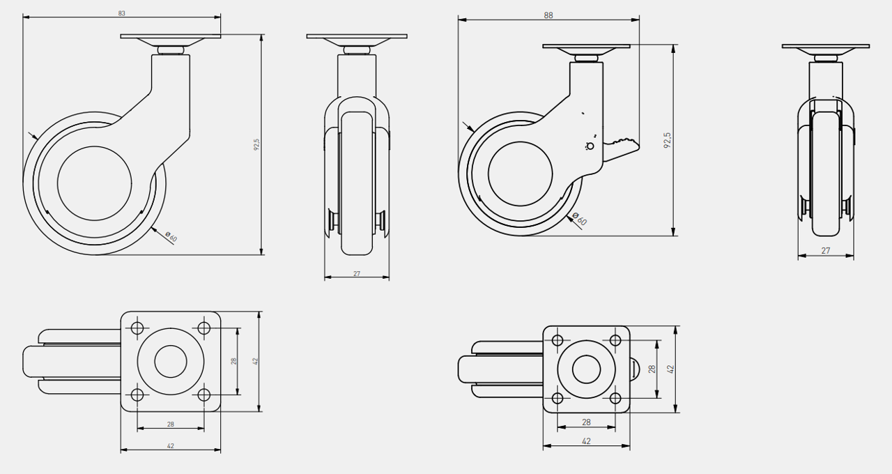 Мебелно колело GTV STRADA от стомана и пластмаса. Без спирачка. Диаметър 60 мм , височина 92.5 мм. Натоварване 30 кг. Цвят: черно. Размер на монтажната планка 42х42 мм. Върти се на 360 градуса.